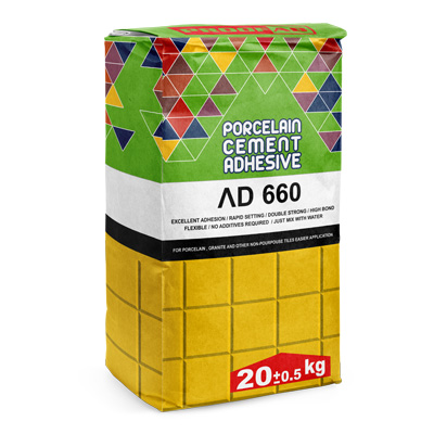 This powdered porcelain tile adhesive is formulated and produced based on copolymer resins, micronized fillers, and cement. When mixed with water, it forms a bonding mortar used for affixing various types of tiles and ceramics to different surfaces. The inclusion of cement and copolymer resins in the formulation ensures excellent adhesion to the underlying surfaces.